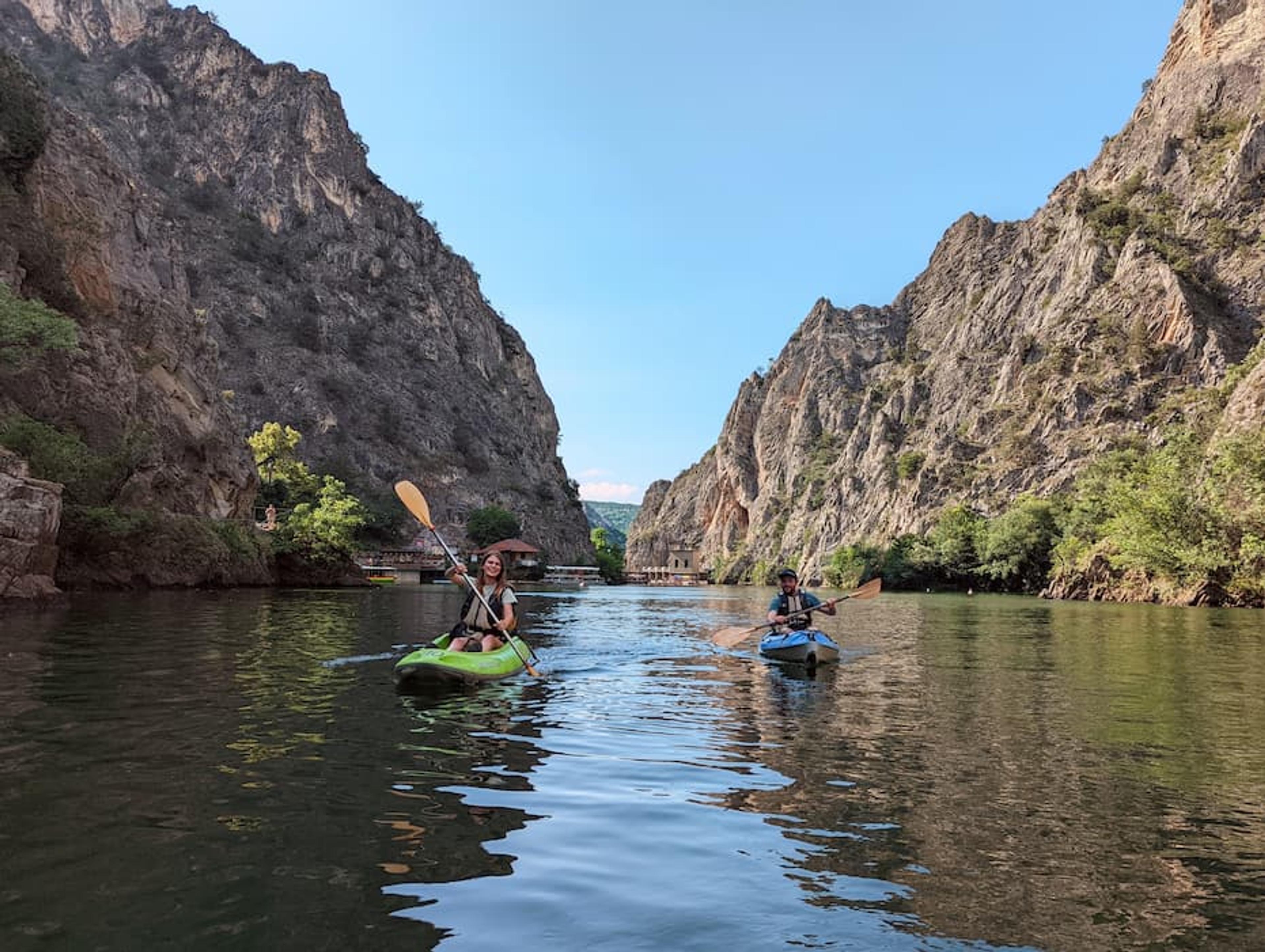 A short 15 minutes down the canyon you get to the dam where there's access to boat trips to a nearby cave, kayaks and a pricey restaurant. We opted for a beer at the bar overlooking the lake and then hopped in the kayaks for an hour for 300 lek. It's been a while since I've been kayaking but I swear the type they were hiring out had a handicap, it was like gliding through day old jelly, and required a frantic hard sprint back to the dock to get back before going over our hour and getting charged double. Getting from the kayak to the dock was an ungraceful affair, only made worse by being directed by the ten year old that now seemed to have taken over from their parent.