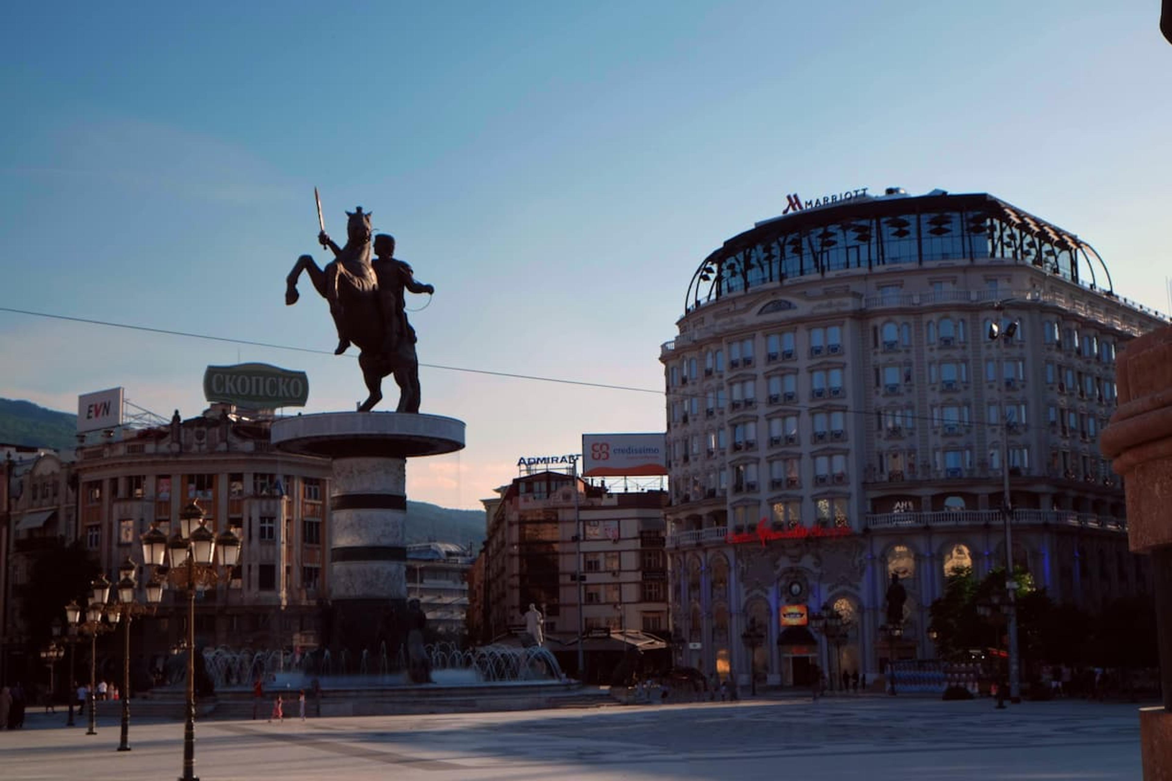 As is tradition in the Balkans we made our way to a street corner and hoped for a bus to turn up to take us to Skopje. As with any place you go people who have been there will give their opinion on the place, but I was looking forward to Skopje just because of the polarising effect it seemed to have on people. Driving into the outskirts of the town is quite unremarkable and a normal concrete block buildings. But as we moved closer to the centre the quirkiness of the place started to manifest, first spotting the iconic London red buses having their second lease of life brought a smile to my face. Closing in on the centre huge statues started dominating roundabouts and then smallers ones popping up regularly along the sidewalks, the facades on prominent buildings started to clash with a mix of modern glass, greek pillars, roman and then communist era brutalist. By this point you start to understand how Skopje has been named City of Kitsch and city of statues, a jumbled mess of styles brought together and seems to have a marmite effect on people.